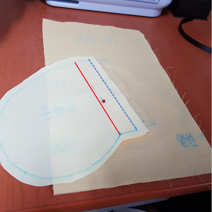 입술감 위에 손등감 안이 보이도록 올린다. 아래 사진에서 몸판의 완성선과 빨간 선을 맞추어서 손등감을 올려야 한다. 책에 완성선 맞추는 방법이 자세히 나오지 않아서 나는 파란 점선을 완성선에 맞췄더니 나중에 주머니 크기가 안 맞아서 뜯고 다시 재봉했다ㅠㅠ
