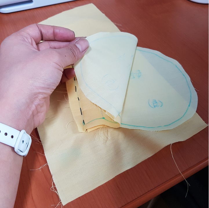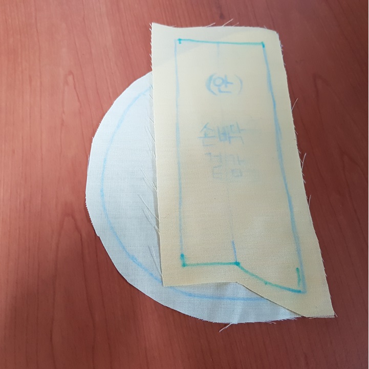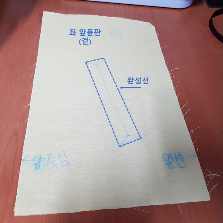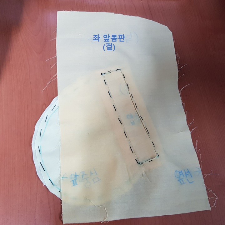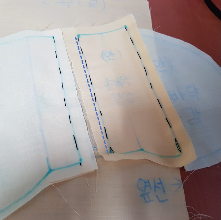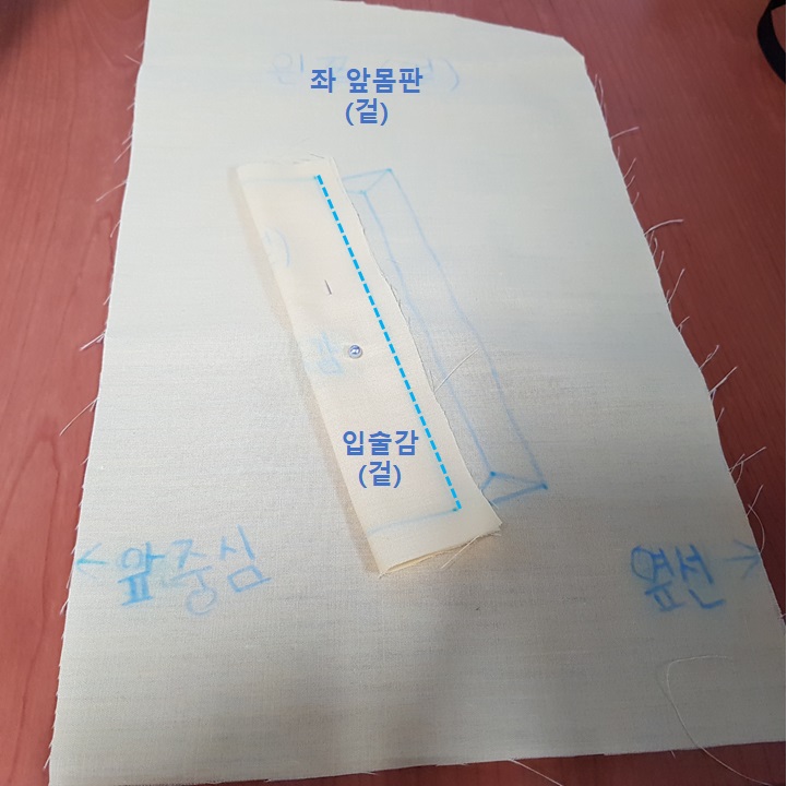 입술감 겉이 보이게 반 접어서 앞 몸판 겉에 완성선을 맞추어 올렸다. 아래 사진에서 파란 점선이 완성선이다.