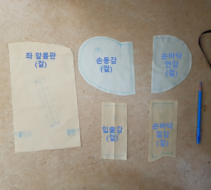 아래 사진에서 왼쪽부터 손바닥 안감 2장, 손등감 2장, 주머니 입술감 2장, 손바닥 겉감 2장이다.