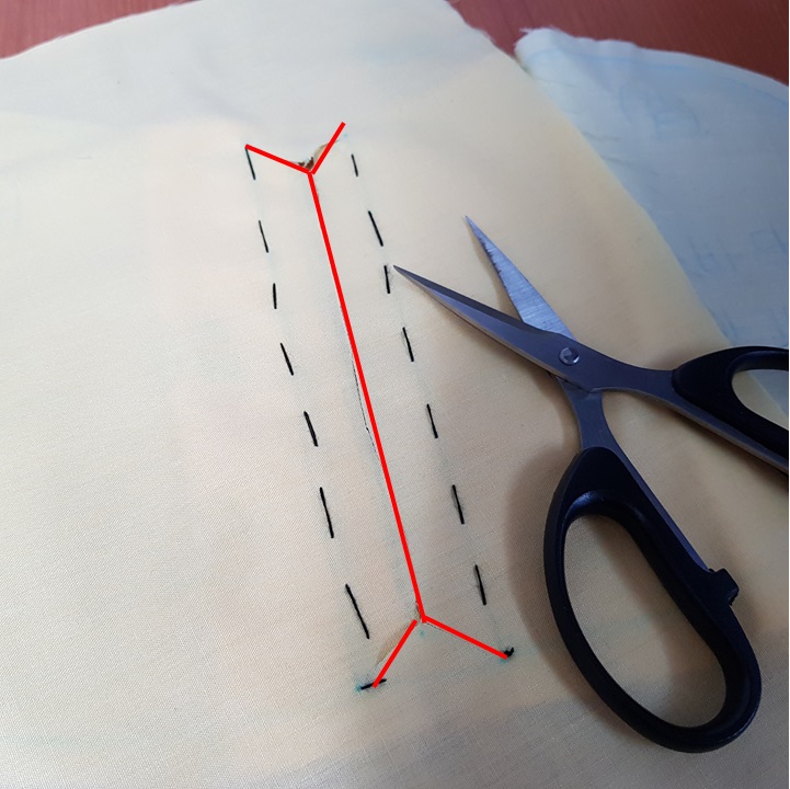 몸판을 뒤집어서 아래 사진과 같이 빨간색 실선 부분에 가위집을 준다. 가위집 낼때 주머니 원단이 잘리지 않도록 주의해야 한다. 사실 이것은 입술주머니 만들기 2번째 연습이다. 첫번째 연습할때 가위집 내다 주머니 원단 잘라먹었다.ㅠㅠ