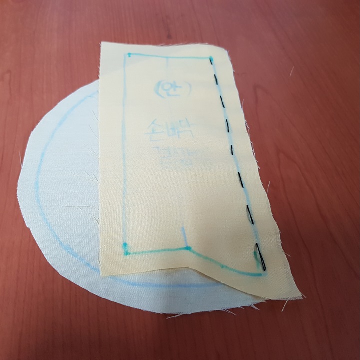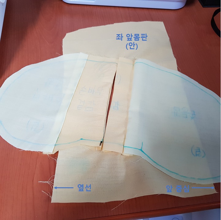 아래 사진과 같이 손바닥감 안쪽이 보이도록 몸판의 겉 완성선에 맞추어 재봉한다.