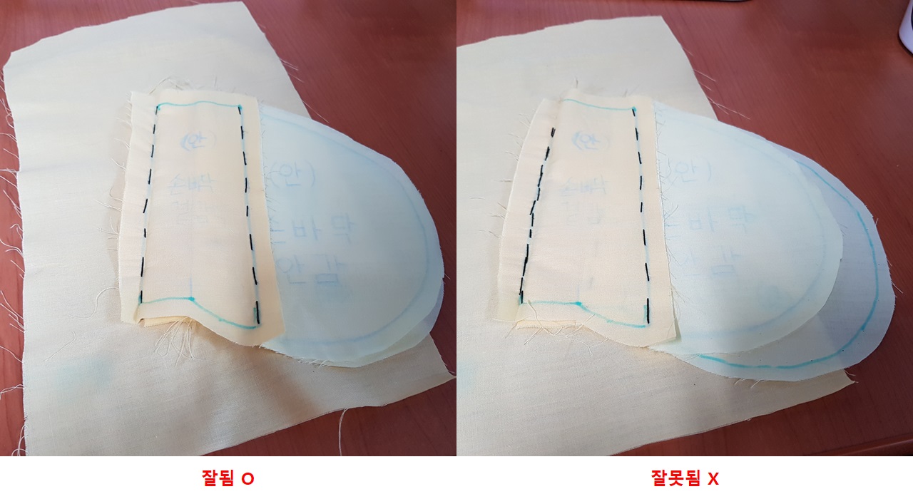 주머니의 손등감과 손바닥감을 맞대었을때 아래 사진의 왼쪽과 같이 되어야 한다. 아래 오른쪽 사진은 5. 손등감 올리기 과정에서 완성선을 잘못 맞추었기 때문에 저렇게 됐다.